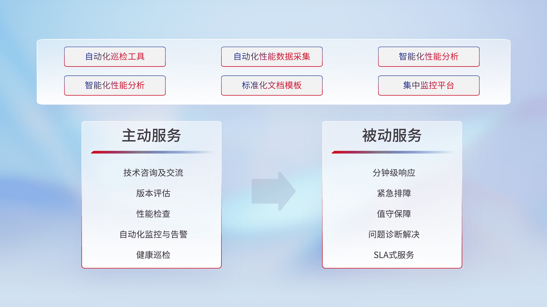 智能化工具和标准化文档,,,,保障服务质量,,提供主动服务(包含技术咨询、、、、版本评估、、性能检查、、自动化监控与告警、、、、健康巡检)和被动服务包含(分钟级响应、、、、紧急排障、、值守保障、、问题诊断解决、、SLA服务)。。。